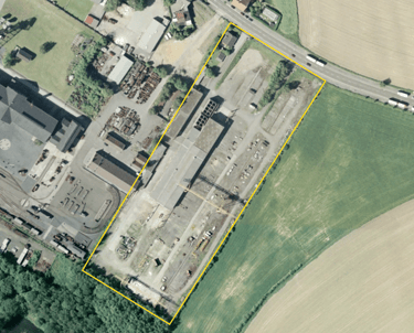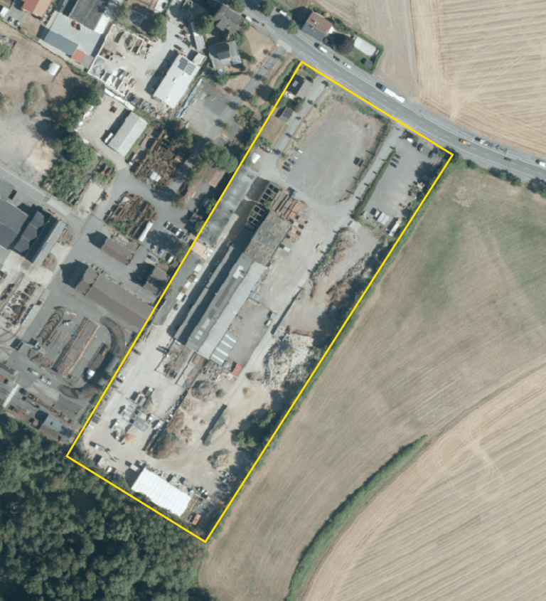 Im Jahr 2018 ist das Gelände vollständig erschlossen und an mehrere Betriebe vermietet. Unter anderem sind ein Stahlhandel und ein großer Garten- und Landschaftsbaubetrieb ansässig. Das Bild zeigt ein Areal, das sich zu einem lebendigen Wirtschaftsstandort entwickelt hat.